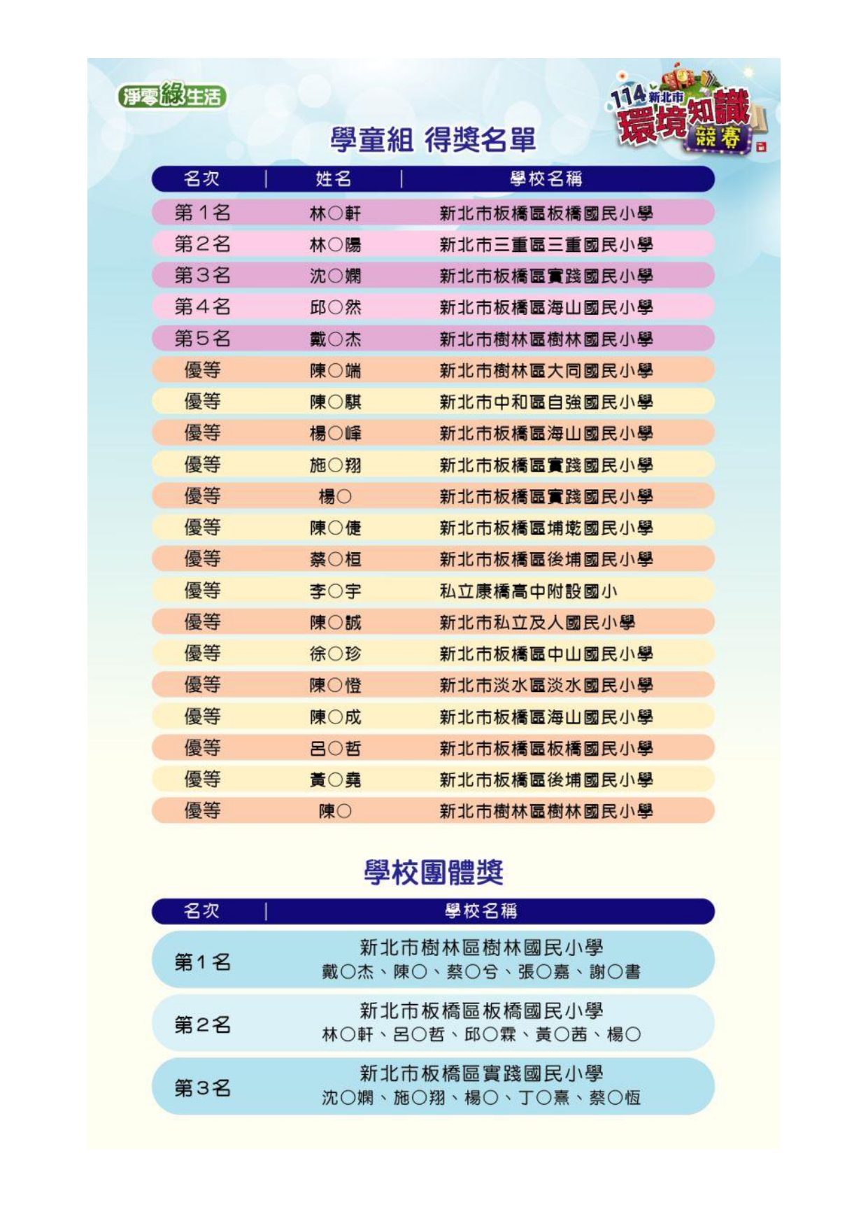 恭賀本校學生參加114年新北市環境知識競賽榮獲佳績
